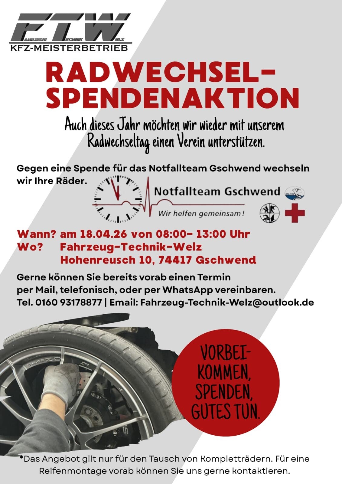 Den gesamten Erlös, welcher durch unsere Radwechselaktion eingenommen wird, werden wir an das Notfallteam Gschwend spenden.